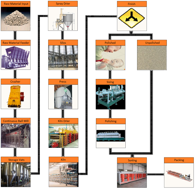 ![]() Raw Material and Storage Feeding The major raw material used in the manufacturing of Vitrified Porcelain Tiles are Ball Clays, Soda Feldspar, Potash Feldspar, Quartz, China Clay, Talc, Zirconium Silicate and body stains. Raw Material Feeder These raw materials are stored in individual locations, and are taken out from their respective locations for loading into a box feeder, with a weighing belt to facilitate weighing different materials before feeding into the balls mills via conveying system. Raw Material Crusher The raw material from the feeder is conveyed to the crusher, to bring the particle to the required mesh size, suitable for ball mill grinding. Continuous Ball Mill The raw materials are then ground in ball mills to make homogeneous slurry and to reduce the particle size of the raw materials. Alumina pebbles are used a grinding media. The water input in the ball mill is controlled by an automatic water flow meter to achieve the correct density of slip. Storage Vats After grinding, the slip is discharged into storage tanks called Vats. The slip is then agitated continuously with high efficiency stirring blades to ensure homogeneity. Spray Drier In this process, the slip from storage vats is sieved and is fed into the spray drier at a constant pressure by means of a high-pressure piston pump. In the spray drier the slip is atomized against hot air to convert slip into granules. Silos The spray dried granules are stored in silos. Ageing of granules in silos increases the working properties of the granules by homogenizing the moisture. Press The granules are then pressed under high pressure by means of an automatic hydraulic press to facilitate formation of tiles of different sizes. Kiln Pre-Drying After pressing, the tiles are moved into a horizontal dryer, where the moisture content in the tile evaporates and the tile picks up its mechanical properties (strength). Kiln Firing Firing is an extremely important stage in the production process since vitrification takes place in this stage. The peak temperature is approximately 1250 oC. The flux in the body melts and resolidifies to form porcelain stoneware. The vitrification process enables the tile to have various mechanical and chemical properties. As firing progresses and temperature increases, the material passes through a number of critical thermal zones, including the cooling at the very end of the kiln. Calibrating / Sizing Fired tiles are fed to the first calibrating unit by a conveyor. Calibration is done to make the surface even by removing a certain amount of material to provide a flat surface. Diamond tools are employed for calibration. Polishing Polishing employs tangential heads to give the tile a mirror like finish without any scratches, shadows or signs of machining. This stage also ensures the squaring and chamfering of sides. Sorting With the help of latest technology, the tiles are automatically sorted into different grades depending on the categorization. The tiles are checked for dimensions, flatness automatically and sorted into appropriate grades. Packing The categorized tiles are the packed in corrugated boxes by an automatic packaging unit, and ready for dispatch. |